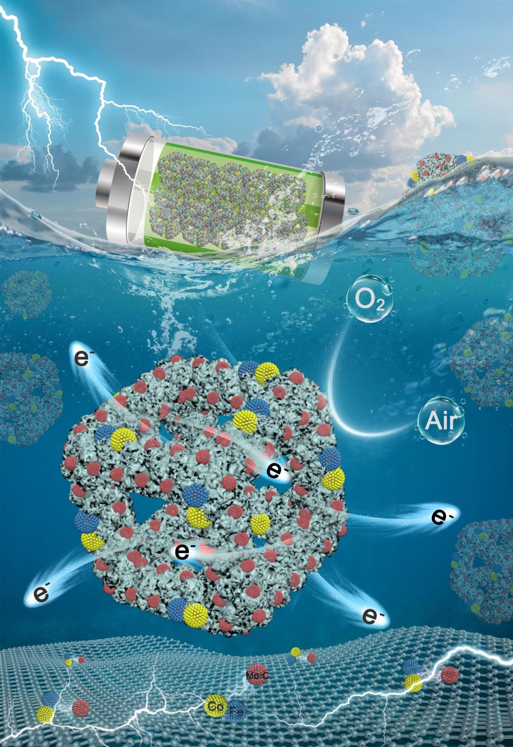 开发高效稳定的氧还原和氧析出双功能电催化剂是实现可充电锌空电池的关键。通常,不同的催化反应具有不同的反应机理和动力学过程,因此需要不同的活性位点来催化上述反应。然而,由于以往不恰当的结构设计,使得仅具有单一活性中心的催化剂,难以同时满足高效的氧还原和氧析出过程。基于此,学科团队负责人张雷教授提出了通过“靶向交换/原位包覆”合成策略,制备了负载有Fe-Co/Mo2C Mott-Schottky的大孔纳米框架。该催化剂具有高导电性和优越的大孔纳米框架结构,能够促进快速的物质/电荷传输,并提供高活性的三相催化界面,同时证明这种材料可以稳定地用于可充电锌-空气电池的空气阴极。相关研究成果以“A Macroporous Carbon Nanoframe for Hosting Mott–Schottky Fe-Co/Mo2C Sites as an Outstanding Bi-functional Oxygen Electrocatalyst”为题发表于《Materials Horizons》。