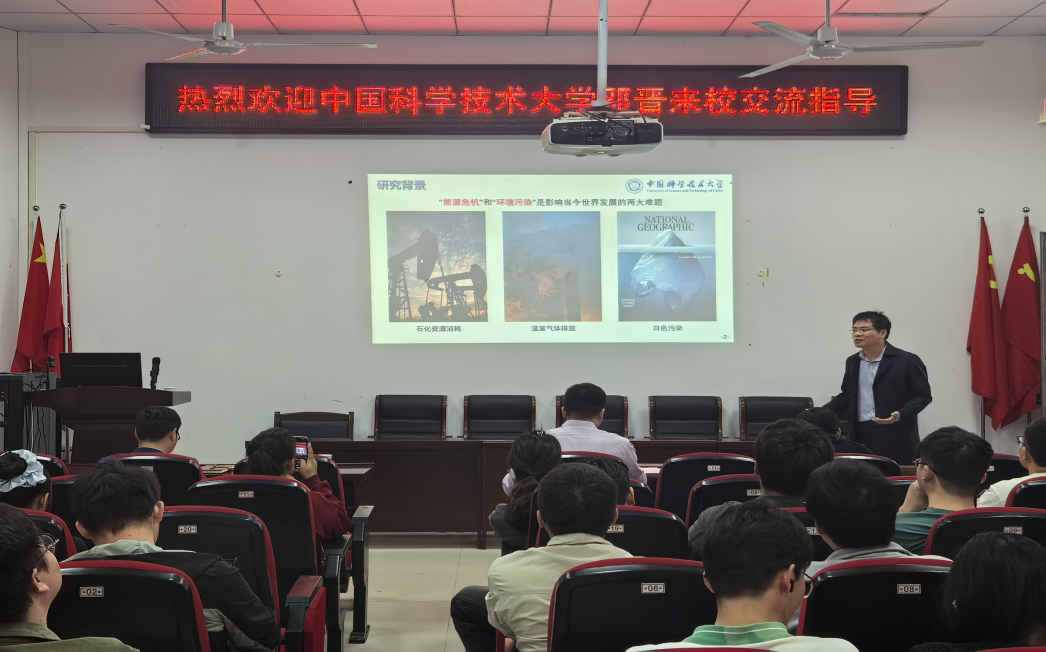 4月22日下午,应校科研部、材料科学与工程学院和研究中心邀请,中国科学技术大学邓晋副研究员来校交流讲学,为师生作题为《有机固废的绿色低碳转化》的学术报告。报告会由学院副院长(主持工作)王庆平主持,来自材料学院的100余名师生参加了本次报告会。