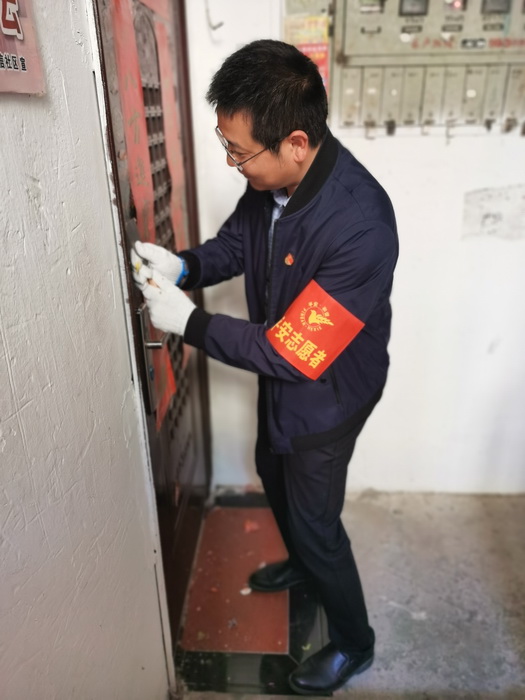 党员们铲除住户门前小广告(摄影:胡珊珊)