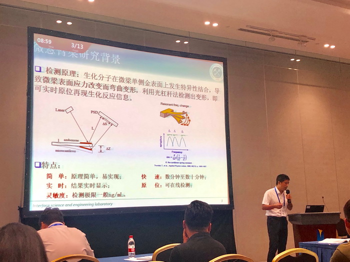 薛长国副教授在MS59实验力学先进测量方法、技术与应用分会场进行了题为《基于玻璃透射扫描的新型微梁阵列系统设计》的学术报告。薛长国博士首次提出了基于激光在空中自动定向设计微梁阵列的设想,实现了对微悬臂梁阵列上每根微悬臂梁自由端的精准扫描。基于此设想先后申请了基于平面镜反射、基于玻璃透射和基于平面镜循环扫描微梁阵列等专利。截止2019年8月28日,以安徽理工大学申请人的微悬臂梁相关专利共22项,专利数量居全国第一,其中发明专利12项。以薛长国为发明人的微悬臂梁相关专利共计20项,居全国第二。